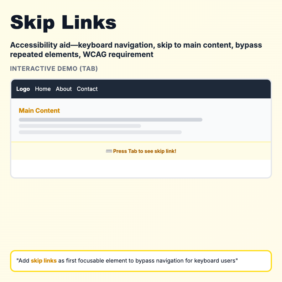 Skip links are hidden links (usually "Skip to main content") that appear at the very top of a page when keyboard users press Tab. They let users jump directly to the main content without tabbing through repetitive navigation menus on every page. Required for WCAG accessibility compliance. Invisible to mouse users but essential for screen reader and keyboard-only users.