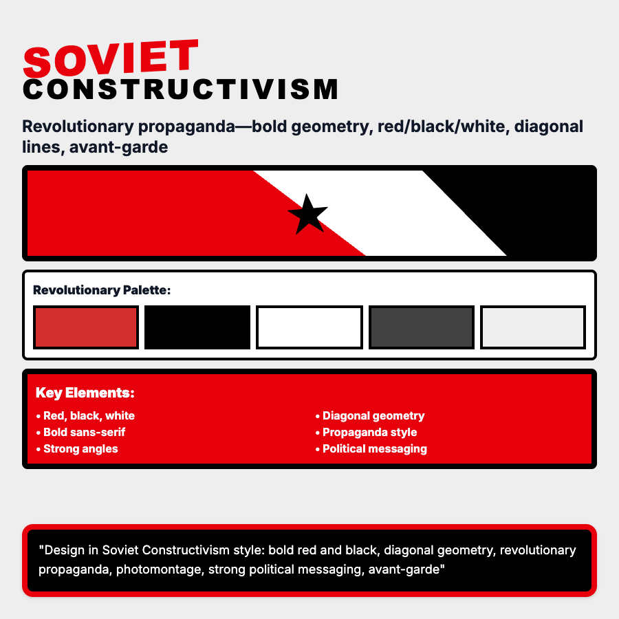 Use constructivism for historical content, political projects, bold statements, or design paying homage to modernist movements. Works for products wanting revolutionary, bold aesthetic. Be aware of political context.