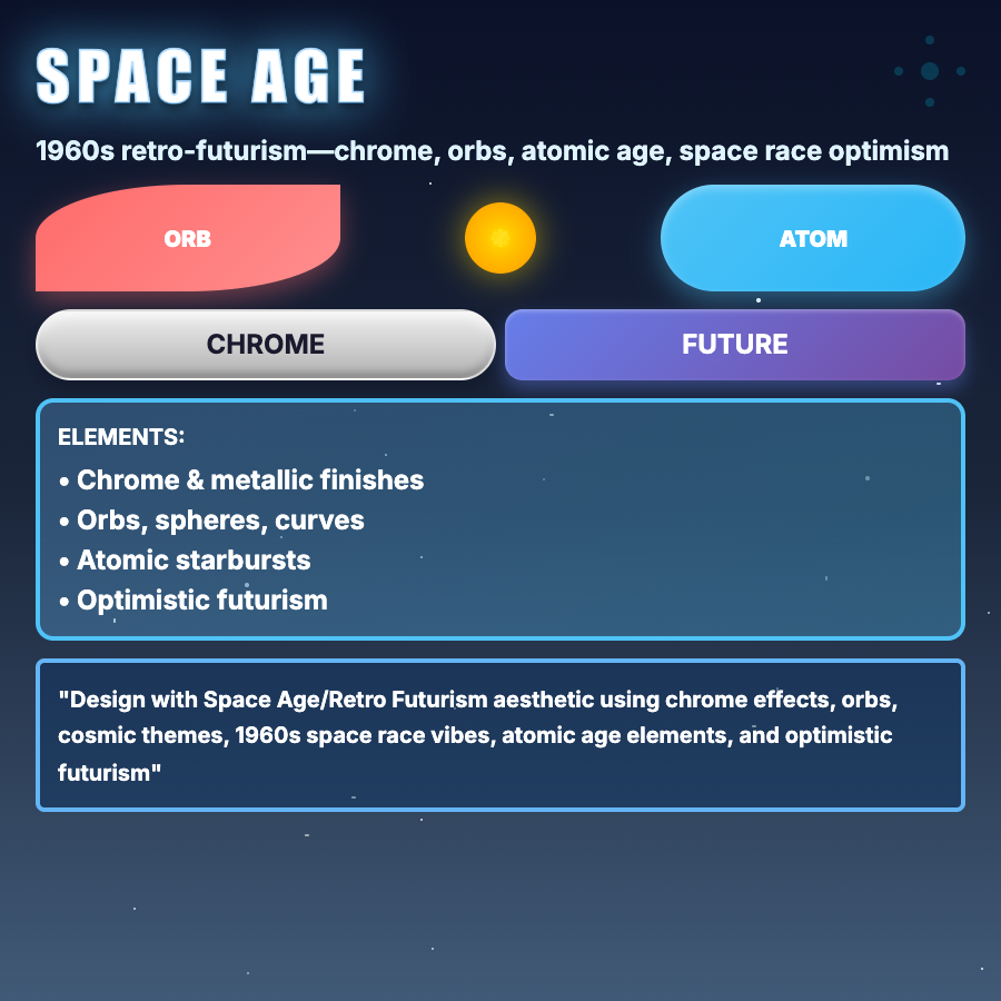 Space Age Design captures 1960s futuristic optimism—atomic/orbital shapes, metallic finishes, bubble elements, white/chrome color schemes, and mid-century modern influence. Represents space race era's optimistic vision of the future.