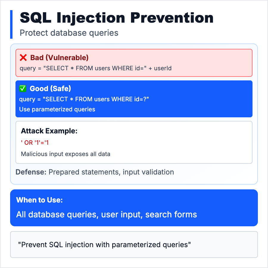 Prevent SQL injection in every app that uses a database. Never concatenate user input into SQL strings—always use parameterized queries or ORMs (Prisma, Drizzle, SQLAlchemy, ActiveRecord). Test with payloads like ' OR 1=1 --, '; DROP TABLE users; --. Use database permissions to limit damage (read-only user for SELECT queries).