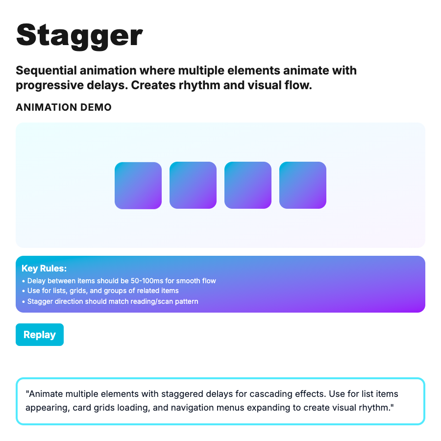Stagger Animations reveal multiple elements sequentially with small delays between each. Creates cascading effect—first item animates, then second, then third. Draws eye down the list and feels more organic than all-at-once. Common for lists, grids, cards entering screen. Delay: 30-80ms between items.