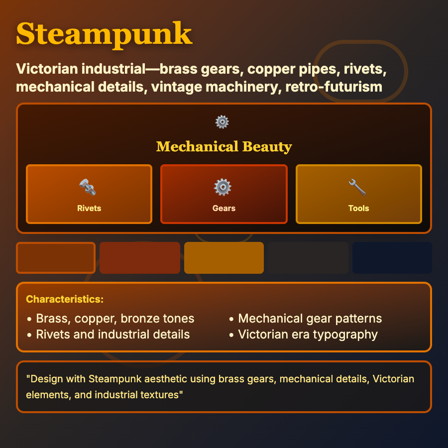 Steampunk Design merges Victorian-era aesthetics with industrial technology—brass fixtures, exposed gears, leather textures, ornate typography, and retro-futuristic machinery. Imagines alternate history where steam power continued as primary technology.