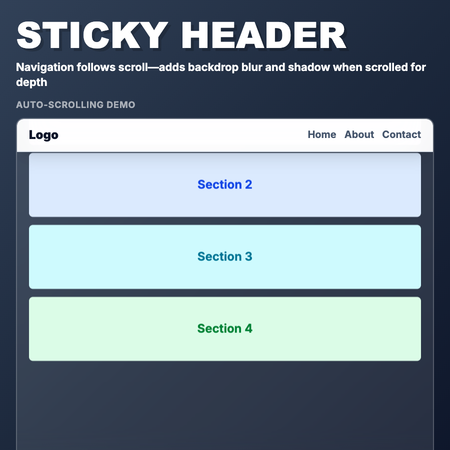 Use sticky headers for all multi-section pages where users need to navigate between sections. Essential for documentation, long-form content, and marketing sites. Consider hiding on scroll down, showing on scroll up for more screen space.
