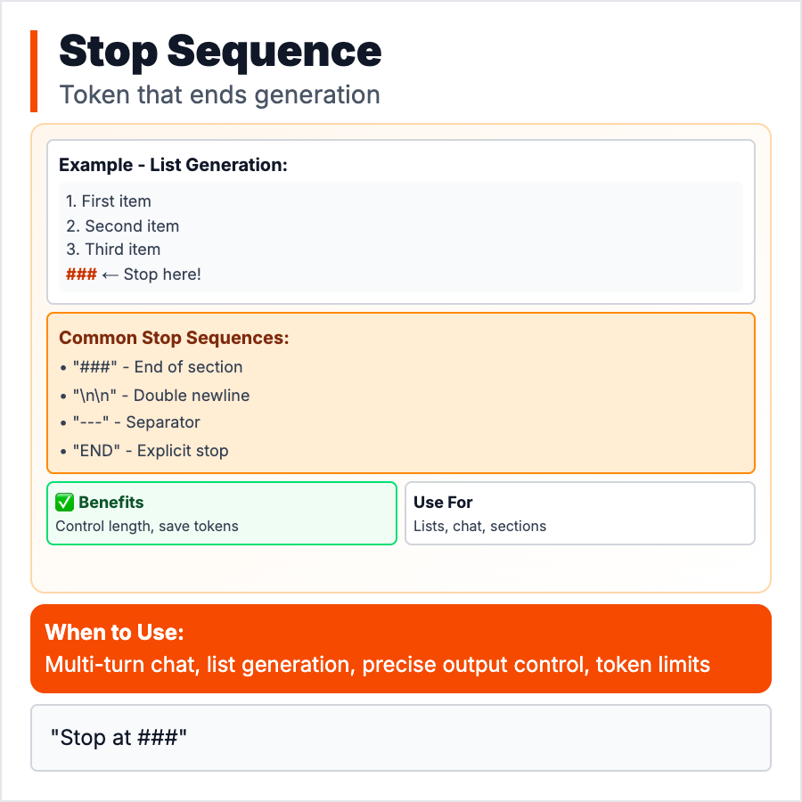 Use stop sequences when you want AI to stop at a specific point: generating one list item (stop at "\n"), extracting first paragraph (stop at "\n\n"), preventing AI from adding commentary after answer, or structured templates (stop at "---"). Great for precise control without complex prompts. Common in code generation (stop at function end), data extraction, or dialogue systems.