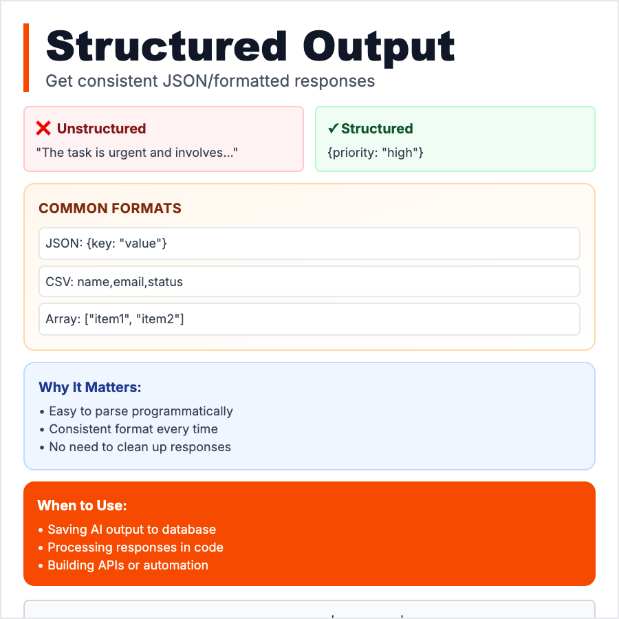 Structured Output is when you force the AI to return data in a specific, machine-readable format (JSON, XML, CSV, YAML) instead of freeform text. You define a schema (e.g., "return {name, email, score}") and the AI fills it in. This makes AI outputs predictable, parsable, and easy to integrate into apps, databases, or workflows—no more regex-parsing messy text.