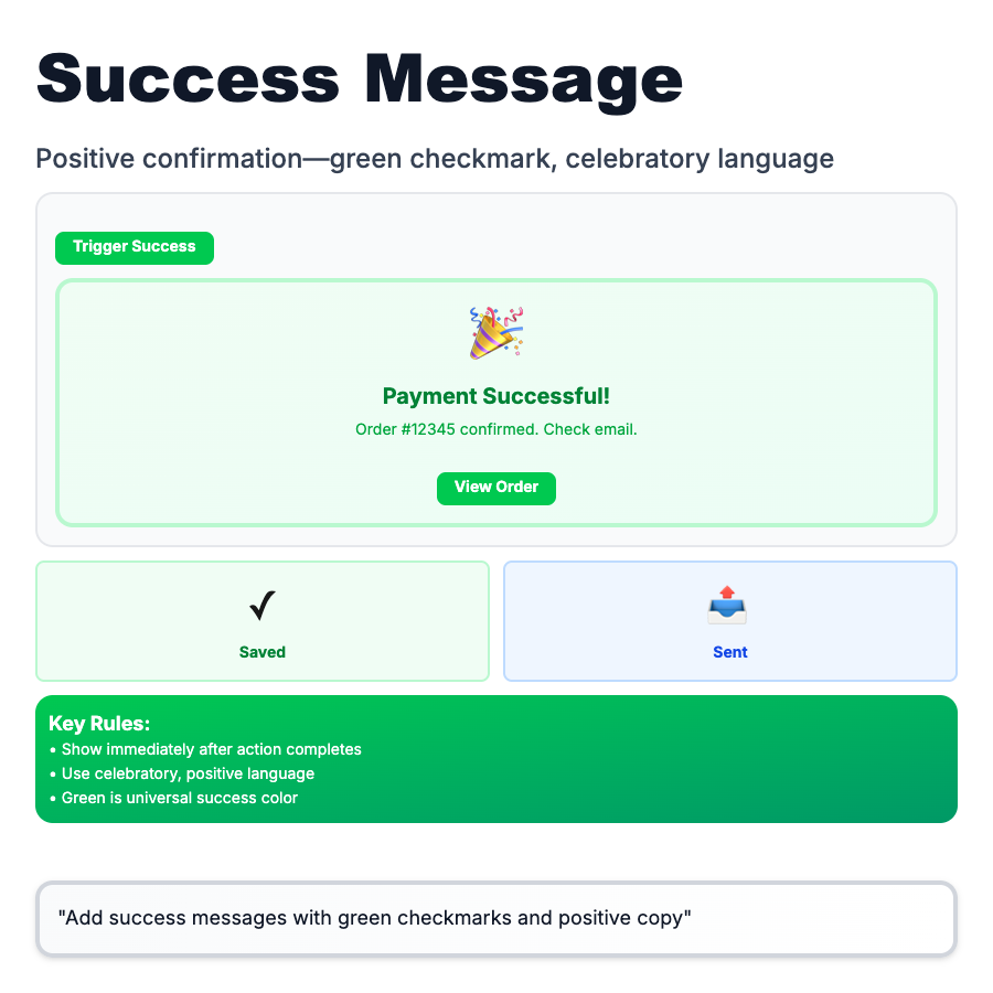 Success Messages confirm that an action completed successfully. Provides closure and positive reinforcement. Can be toast (temporary), banner (persistent), or inline (near action). Use green color and checkmark icon. Keep brief and specific: "Invoice sent" not "Action completed successfully."