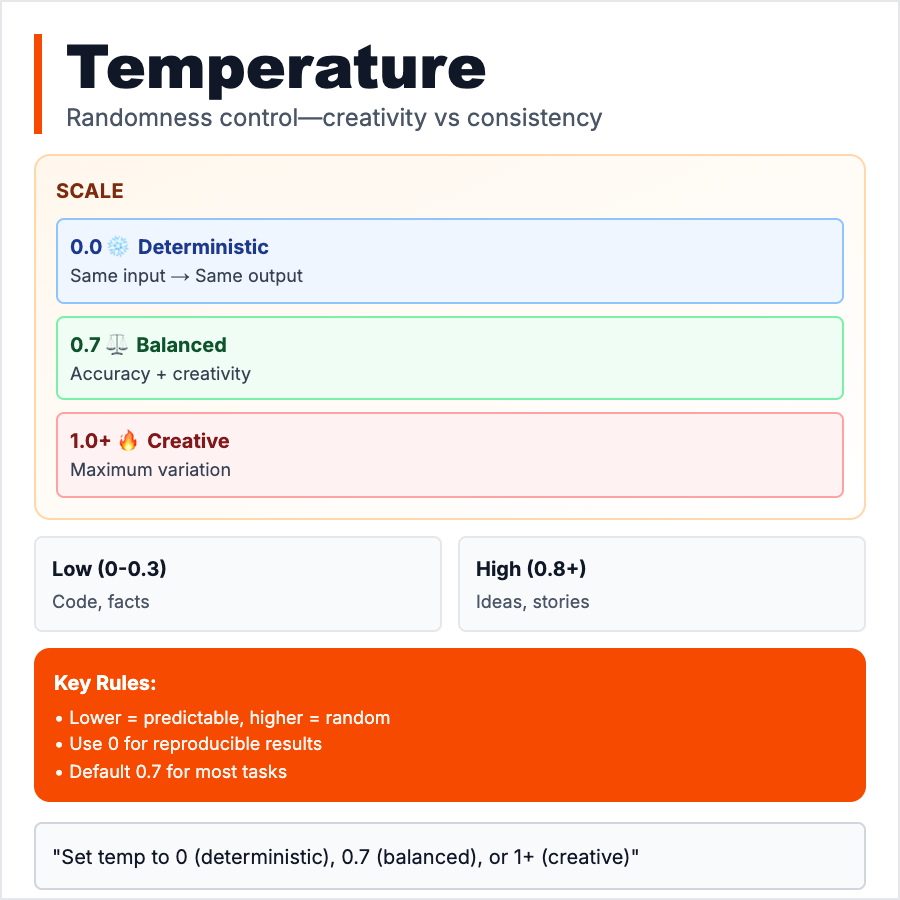 Temperature controls how random or creative the AI is. Temperature=0: deterministic, always picks most likely word (same input = same output). Temperature=1: creative, picks from many options (different outputs each time). Scale: 0.0 to 2.0, default usually 0.7-1.0. Low temperature (0-0.3) for facts, code, consistent outputs. High temperature (0.7-1.5) for creative writing, brainstorming, variety. Single most important parameter to tune.
