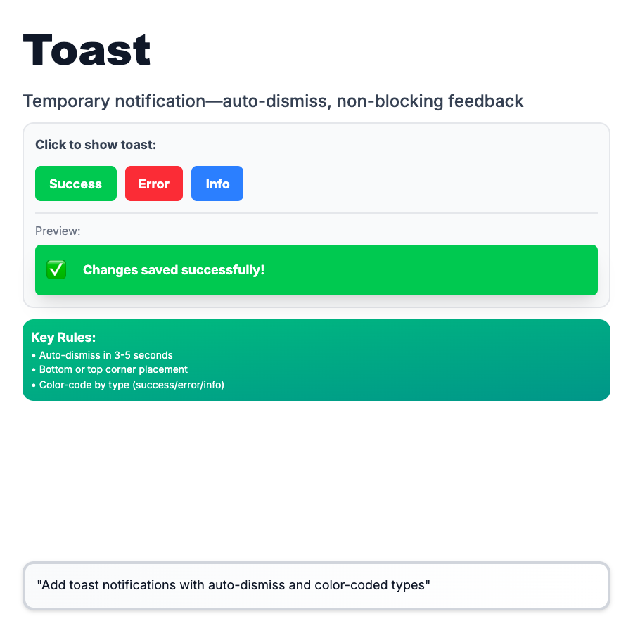Toast Notifications (Snackbars) are brief, temporary messages that appear at the edge of the screen to confirm actions or provide lightweight feedback. Auto-dismiss after 3-5 seconds. Non-blocking—users can continue working while toast is visible. Common for "Saved," "Copied," "Deleted" confirmations.