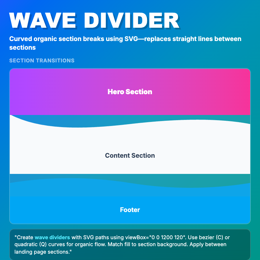 Wave Divider creates curved, organic separation between page sections using SVG waves or curved shapes. Replaces straight horizontal dividers with flowing curves. Adds visual interest, rhythm, and organic feel. Easy to implement with SVG or CSS clip-path.