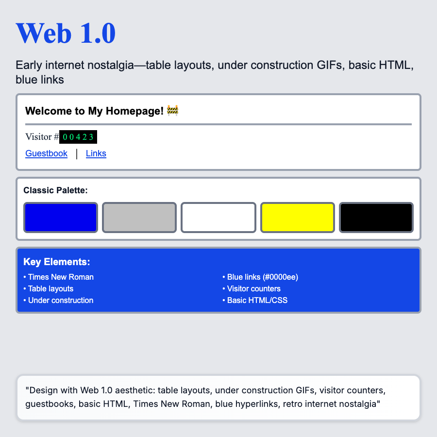 Web 1.0 Design recreates early internet aesthetics (1991-2004)—table layouts, basic HTML, animated GIFs, under construction signs, visitor counters, Times New Roman, and amateur hand-coded charm. Evokes GeoCities and early personal websites.